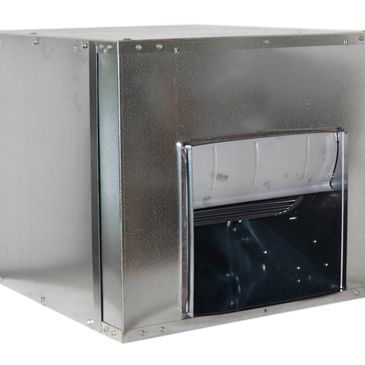 Direct drive duct fan designed for interior supply, exhaust, make up air, or ducted return applications. Units feature forward-curved wheel, EC Motor, and powder coated housing. Available in 9 to 12" sizes for up to 3,000 CFM.